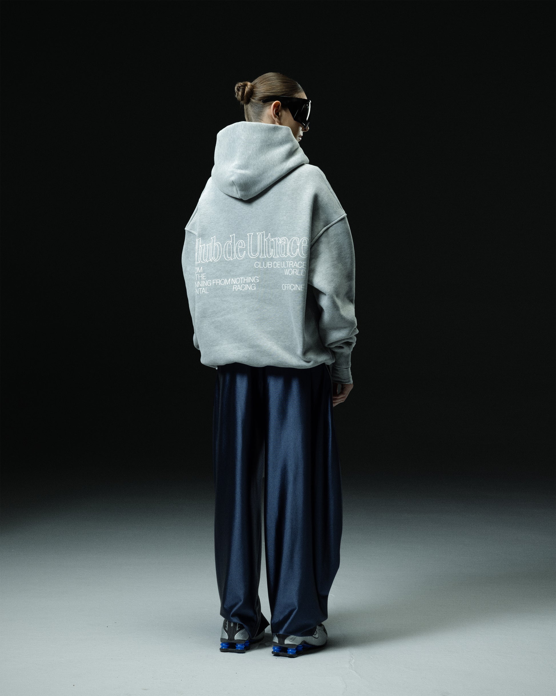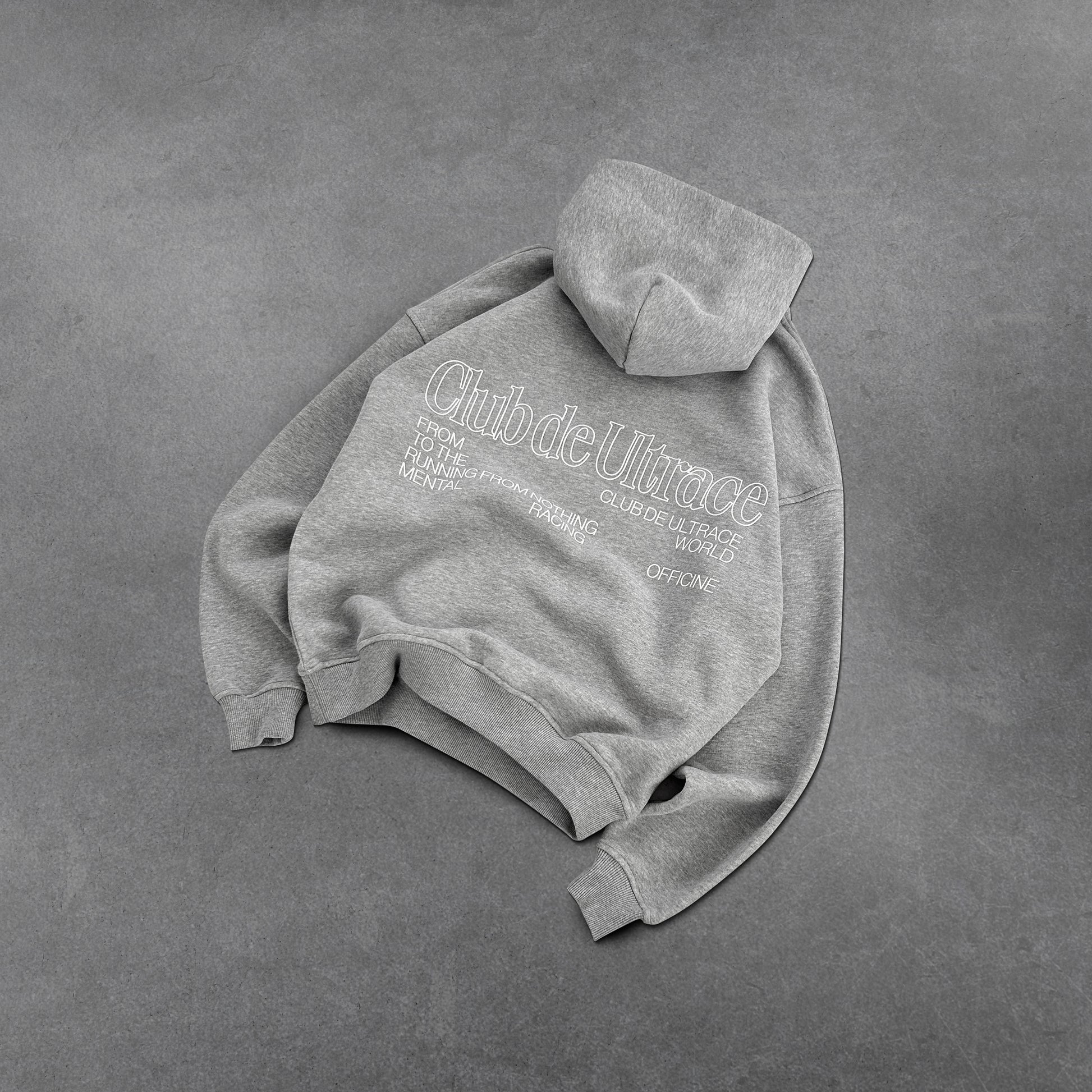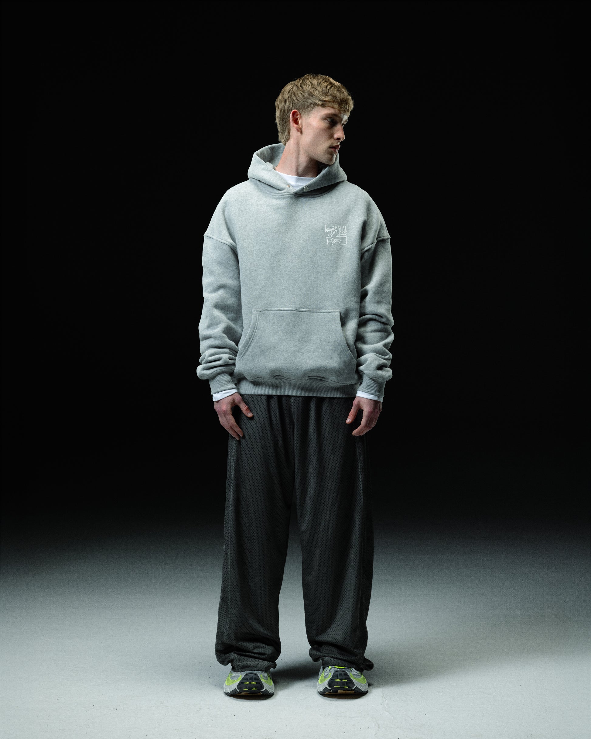 A slightly oversized hoodie in gray melange with white accents. Made from 380gsm cotton. The front and back feature a multi-layer screen print, and a steel emblem on the pocket. The strings have been replaced with buttons with an engraved logo emblem.